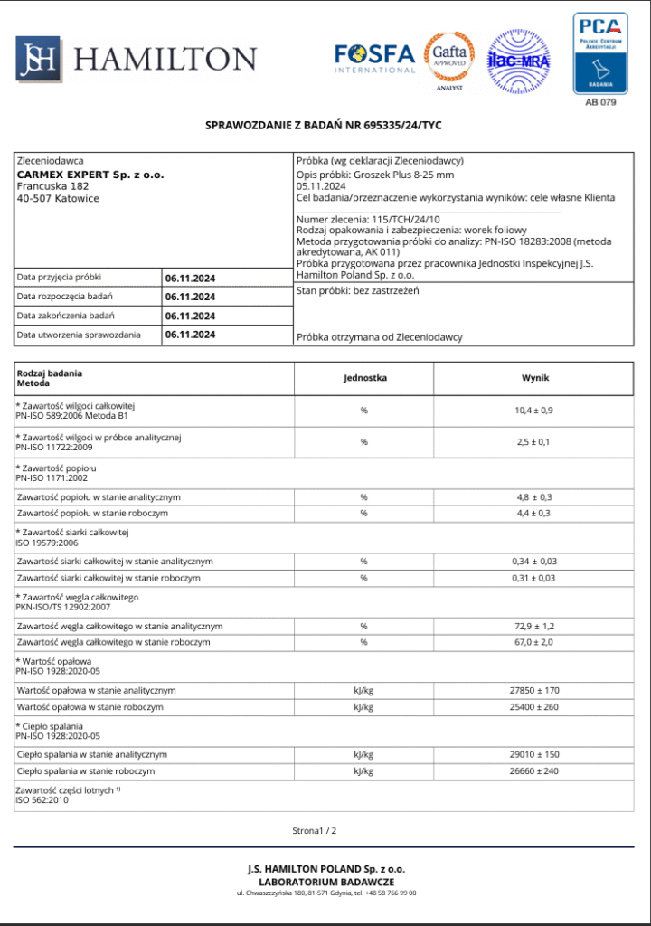 Groszek Plus 8–25 mm is a high-calorific coal intended for heating applications in modern boiler installations as well as for further wholesale distribution. The offered raw material is characterized by excellent quality parameters, confirmed by certified tests conducted by the independent laboratory J.S. Hamilton Poland Sp. z o.o..