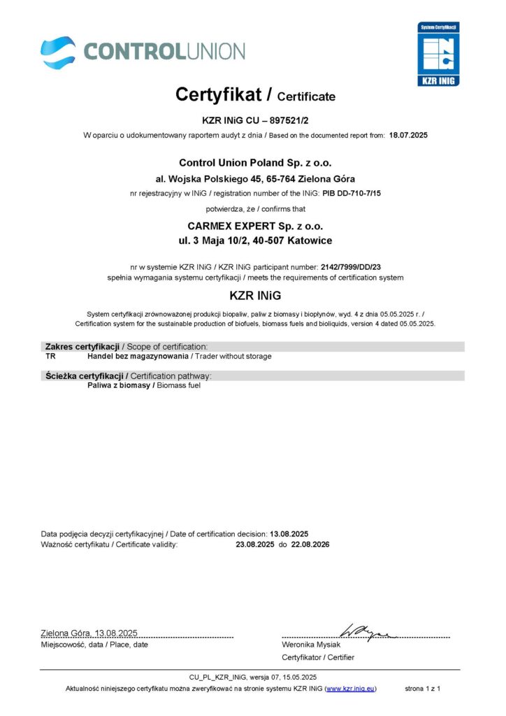 We hold the INiG KZR certificate, which confirms that our processes align with the National Verification System for Sustainable Development of biofuels and bioliquids. This certification authorizes us to trade biomass in accordance with the sustainability requirements defined in national and EU regulations.