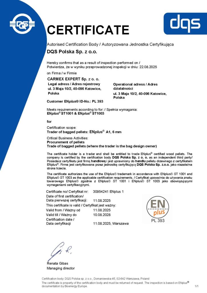 Carmex Expert Sp. z o.o. has obtained the prestigious ENplus® certificate (ID: PL 393), confirming that as a trading company we meet the highest European quality standards in the wood pellet market. The certification process was conducted by the independent body DQS Polska Sp. z o.o., in compliance with the ENplus® ST 1001 and ST 1003 standards.