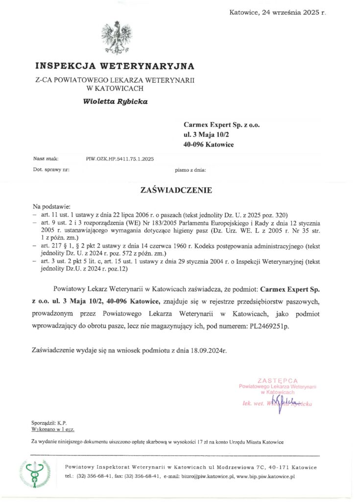 Carmex Expert Sp. z o.o. is officially registered in the feed business operators’ register maintained by the District Veterinary Officer in Katowice. We have received an official certificate confirming our authorization to place feed on the market, in full compliance with Polish and EU feed safety and hygiene regulations.
